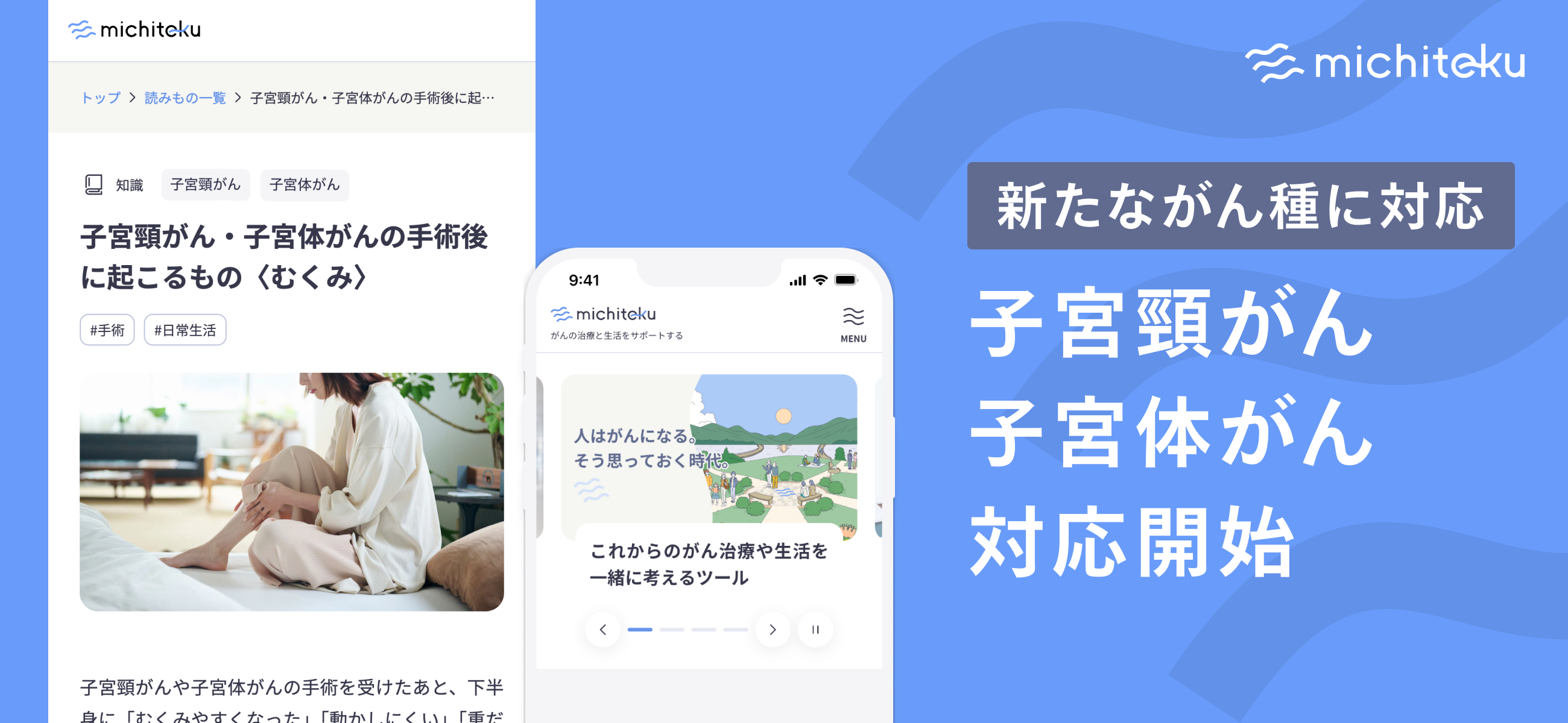 株式会社michiteku(本社:東京都中央区、代表取締役社長:藤山 昌彦、以下「当社」)は、がん患者さん向け治療生活サポートツール「michiteku」β版ににおいて、婦人科領域のがんである「子宮頸がん」および「子宮体がん」のコンテンツを新たに追加し、提供開始したことをお知らせいたします。