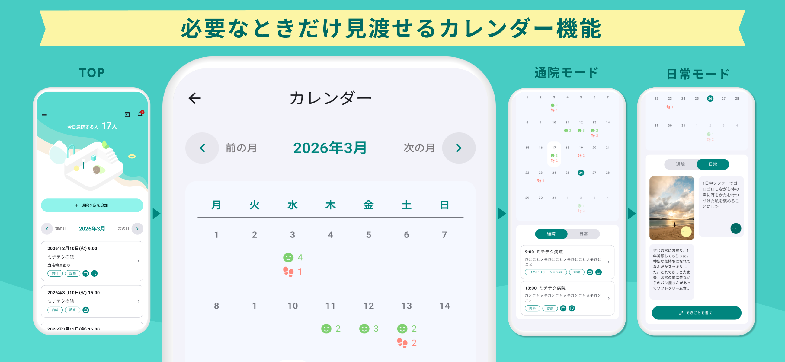 ・月ごとの通院予定と日常の記録をひとつの画面で見渡せるカレンダー機能を追加
